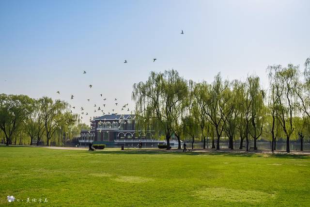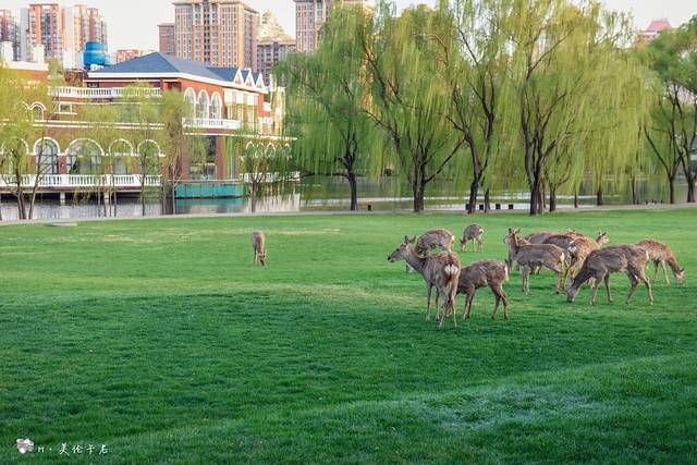 一旦驶入才发现其中别有洞天,绿草成茵,湖水清澈,垂柳依依,湖面珍禽游弋,有鸭子、鸳鸯、银鸥、天鹅等数十种鸟类,还有一群肥嘟嘟的鸽子和散养的梅花鹿在草坪上闲庭信步。