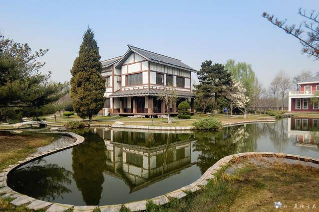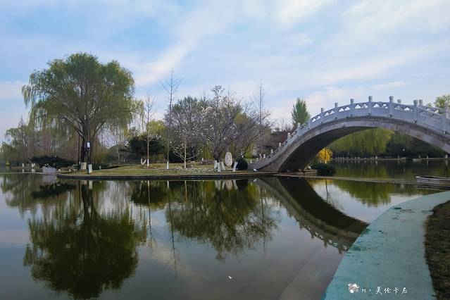 导航“和园景逸大酒店”,进入之后从酒店停车场穿过一条马路就可以到达了,弯弯的拱桥倒映水中,玉兰和迎春映了一池,落花满春光,疏柳映新塘。旁边的草坪上更是一片欢乐祥和的景致,奔跑的小男孩努力放飞风筝,三三两两的外国小帅哥展示着精湛球技,其乐融融的家人围坐在一起,这才是春天最惬意的模样。