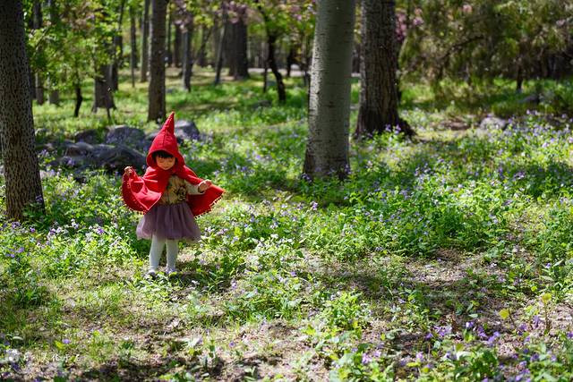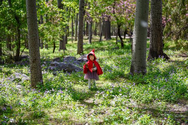 有一条以枕木搭建而成的千米栈道婉转于林间,两侧春意盎然,树叶青翠欲滴,花朵团团锦簇,一路经过人工湿地、石砌隧道、人工瀑布,移步易景,美景纷呈。在栈道上慢悠悠的散步,曲径通幽处,有山风拂面,有花香萦鼻,有流水鸟鸣,仿佛置身于深山幽谷中。路过一片幽静的树林,地上开满了紫色的二月兰,小丫头在里面快乐地玩耍,像极了去找狼外婆的小红帽。