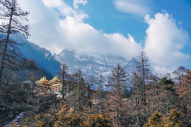 在电瓶车售票处就可以很清晰看到一座寺庙,那便是冲古寺,在葱葱郁郁的云杉下,与蓝天白云相映成画,神圣而肃穆。春日的稻城微风拂面,仿佛历经一场心灵的洗涤。