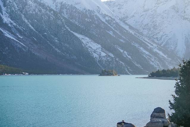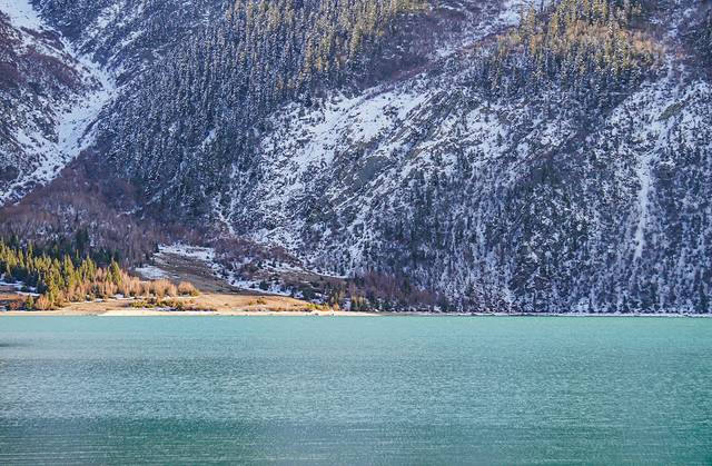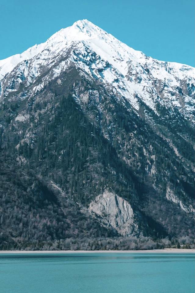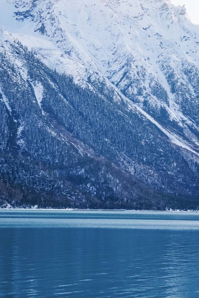 我觉得春夏之交的然乌湖是最美的,这个时候还可能会遇上美丽的雪景,然乌湖以往蓝色的湖水在雪山环抱下呈现出淡淡的墨绿色,没有风的时候,湖面平静得像一面镜子,格外静谧。
