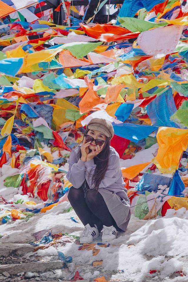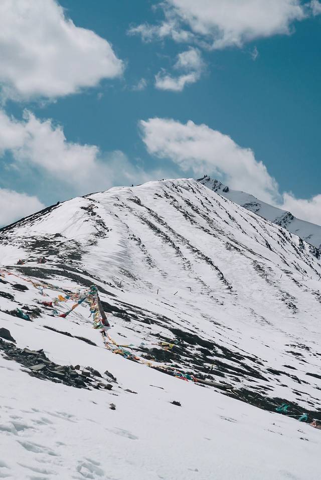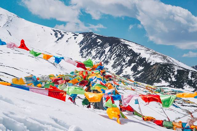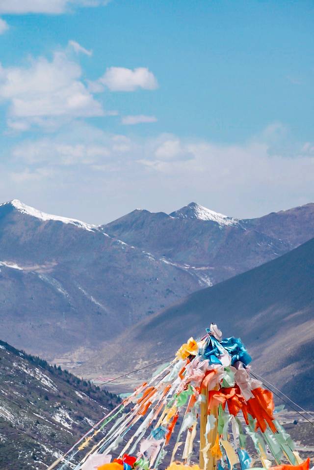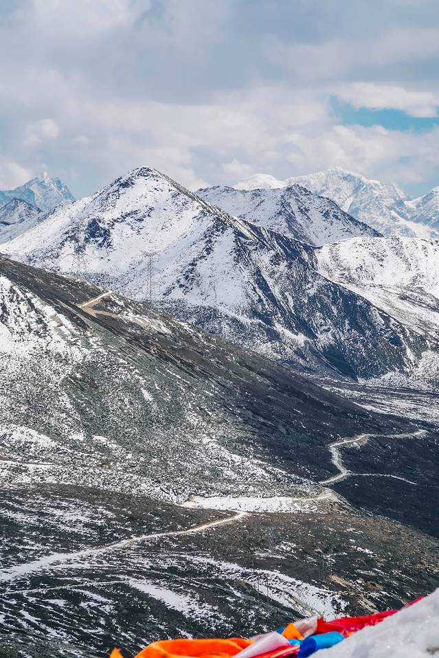 如果想要看到最美景观就要爬上山顶观景台,山顶上经幡环绕,随风飘扬,为雪山增色不少。绕到经幡背后就能看到山下的盘山公路和远处的雪山,非常壮观。