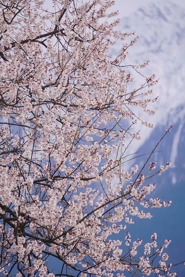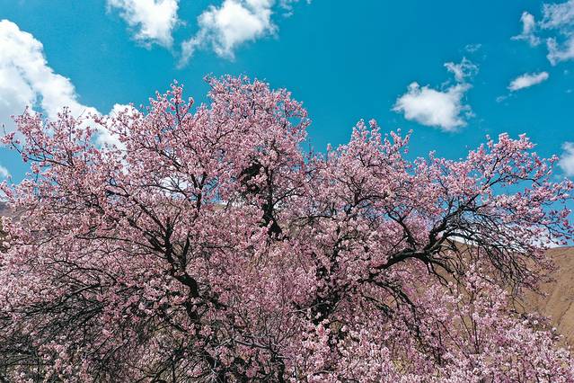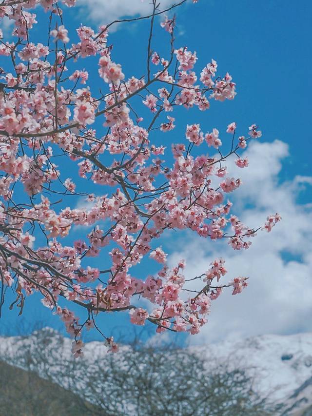 大朵大朵的桃花开满了枝桠,如燃烧的粉色火焰,艳丽而不媚俗,映着远处皑皑的雪山,在湛蓝的天空下,漫山遍野桃花盛开的嘎拉村美得词穷。