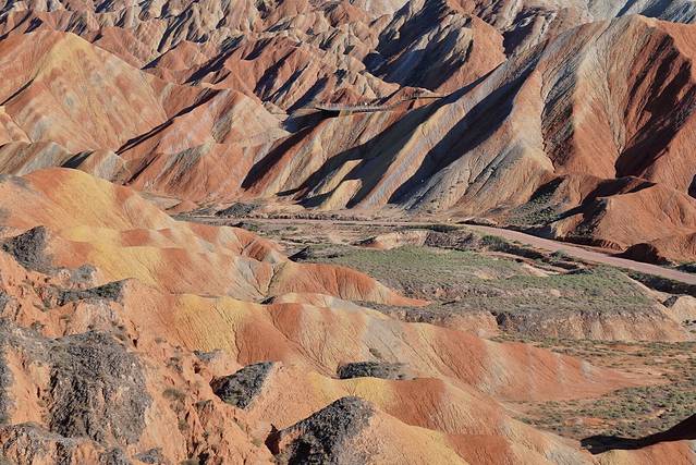来到观景台,放眼望去,一幅幅油画呈现在眼前。七彩丹霞的美在于它的色,在阳光照射下,红、黄、橙、绿、白等多种鲜艳的色彩层次分明。有的山脉红黄相间,有的山脉黄白相间,绵延数百里的彩丘,犹如一条条艳丽的绸缎飘挂丘陵之中,那么的和谐自然。