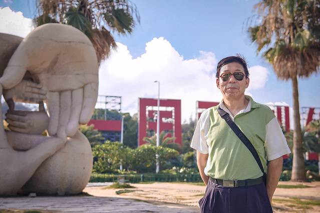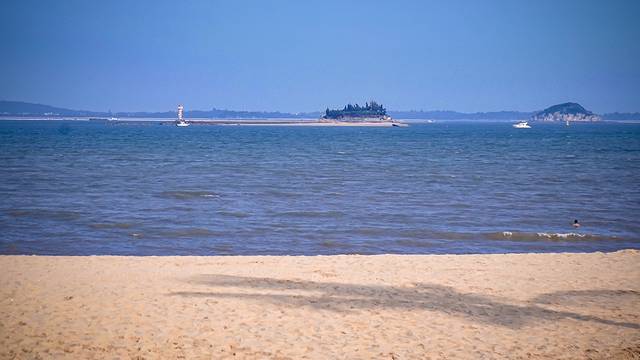 作为起点的会展中心前,是一片非常开阔的沙滩。沿着沙滩,是铺设完善步行道和骑行道。眺望远方,隐约还能看见观音山的观音像和CBD区域的各种高楼大厦。这片沙滩上几乎没有游客,也几乎没有遮荫的椰子树。虽然已经过了骄阳正午,无遮挡的海边依然让人睁不开眼。