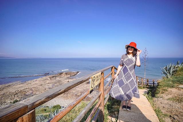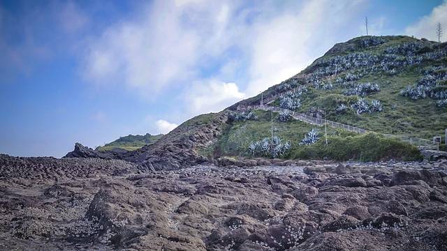 同样是一方悬崖峭壁,白塘湾搭了一条通向沙滩长长的木栈道。在高处欣赏完辽阔的一线海景,慢慢往下走就能看到白塘湾的精华——黑色火山岩。海景,沙滩,火山岩,这些能走近的风景让白塘湾的玩耍体验层次更丰富。