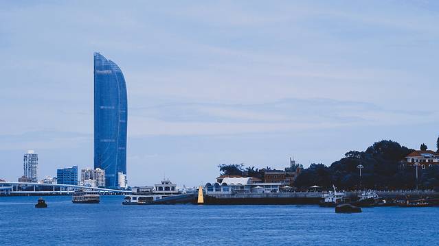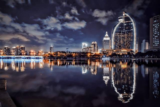 白鹭洲在厦门也挺出名的,白天是一个拥有人工内湖的大公园,是市民散步的好出去,但说是景点就差点意思了。到了夜里,那就不大一样了。湖边坐落着不少豪华酒店,亮起灯之后瞬间增色。而且晚上还有音乐喷泉和灯光秀,都是卖点来的。