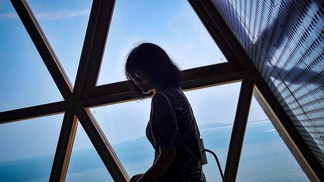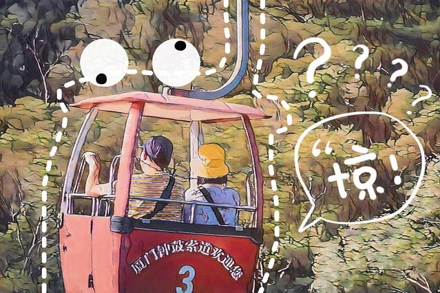 钟鼓索道还是挺古朴的,开放式的车厢只能做两个人。于是老爹被迫去和其他小姑娘坐一车了,可看我爹还挺开心啊。老爹是个社牛,一个来回的时间把人家的行程扒了个遍,什么双子塔,什么植物园。然而人家姑娘跟他打听好吃好玩的时候,老爹只能跟人家说我们去了一个海边这种无效信息。哈哈哈哈~