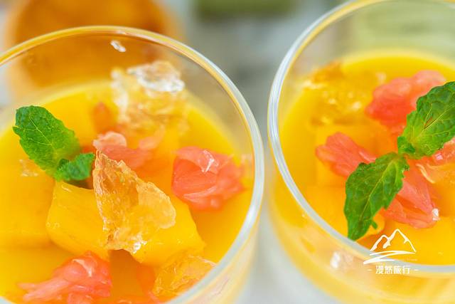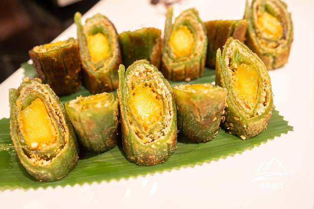 第二道是甜薄撑,绿色的外衣下,包裹着明黄,这色彩颇有春日浪漫气息,又有哪个女生能抵住这样的春日美食诱惑呢?先下嘴为强了。一口下去,酥脆,柔软,直逼核心的那抹明黄,竟是美味的芒果,作为芒果控的我,忍不住边吃边点头,实在太满足了。