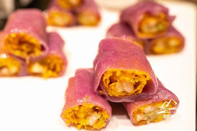 分享两道漫悠最为喜欢的点心。第一道是石磨鲜虾紫米肠,坦白说,紫色控的我看到这道菜瞬间被惊艳到了,旁边的小鱼同学也在说着赞美之词,果然小仙女们都是颜控。