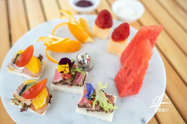 轻奢露营怎能少了下午茶的身影呢。点了一份“清凉一夏”主题下午茶,包含芒果西番莲慕斯,青苹果蛋糕,椰子慕斯,杨枝甘露布丁,抹茶树莓蛋糕,金枪鱼配番茄沙沙等等,这五颜六色,精美的糕点饮料一端上来,精致感瞬间铺满了整个天地间。