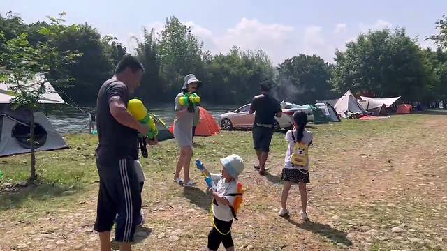 中午太阳够晒,很热时,开始打水仗,男人不管多大,只要给他个玩具,就能像个孩子一样玩嗨,几家人在一场激烈的打水仗游戏中嗨到极点。