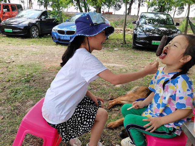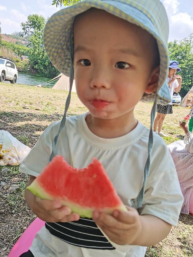 大人们煮面条,烧烤,卷饼,从早晨一直吃到中午。切了泡在河水里的冰西瓜,给炎热的天气降降温。还啃了黄瓜,吃了雪糕,这些平时在家都不能吃的零食,在这让孩子吃得满足。