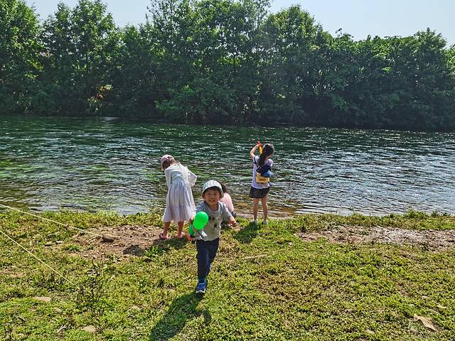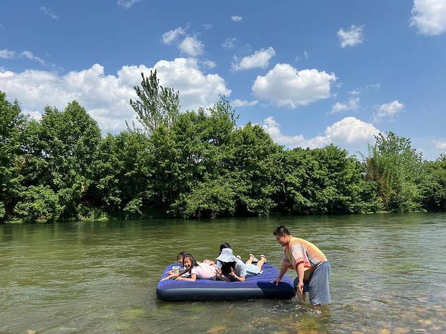 玩漂流,用充气床垫放河水里,顺着水势往下游走,在岸边停靠后,扛着垫子回到了起点,几个孩子还嚷着要玩,考虑到安全问题,就罢了。