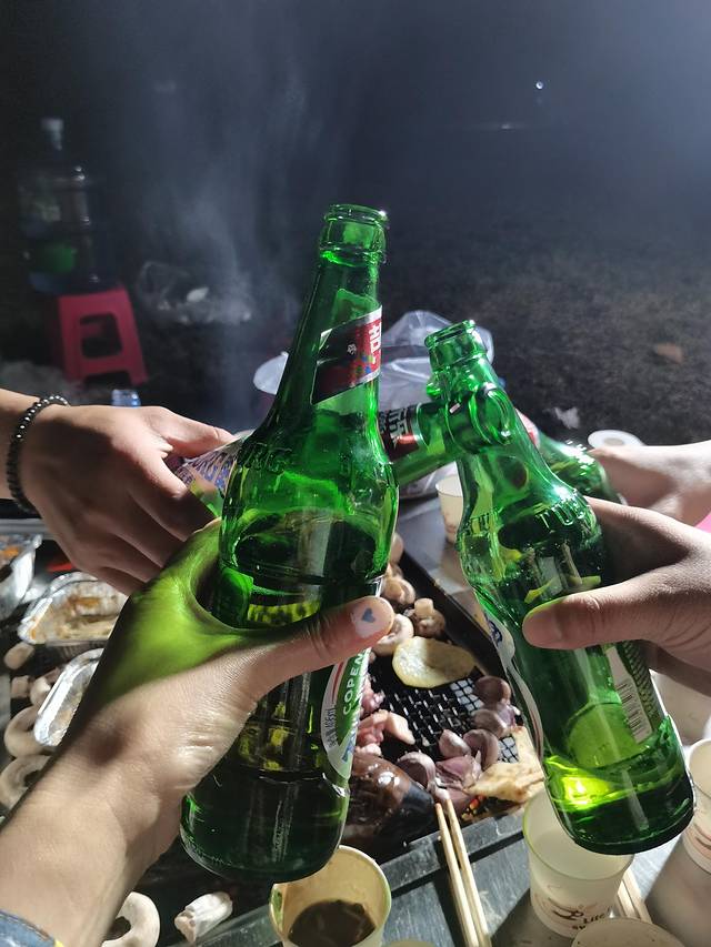 自制的洋葱羊肉、蒜香牛肉、烤茄子、锡纸鸡蛋、烤白蘑菇等,把孩子喂饱,去玩耍了,大人们就可以啤酒配烧烤。聊聊生活,吐槽工作,说说孩子,一会就到了凌晨两点,肉吃得饱饱,酒也喝得满足。