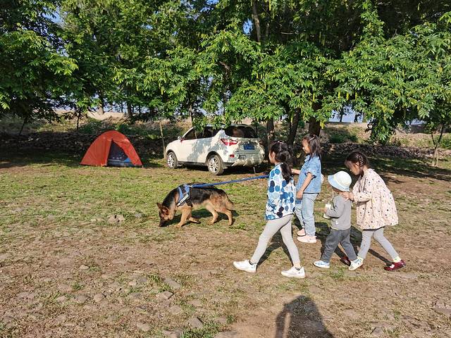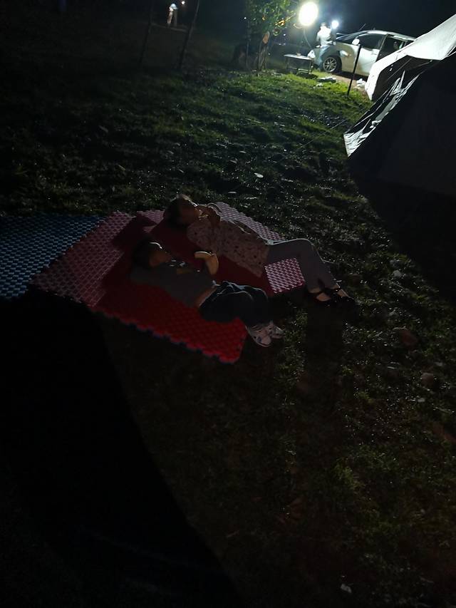 到达时天已黑了,迅速把帐篷搭好,孩子在旁边的泡沫垫上玩得很嗨皮,哥哥家的女儿和我家的孩子,两姐弟相互陪伴,和同事家的大狗逗逗乐,等我们把帐篷搭好就可以准备烧烤了。