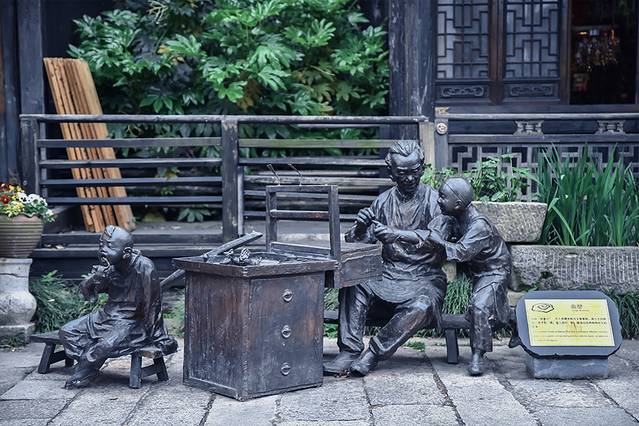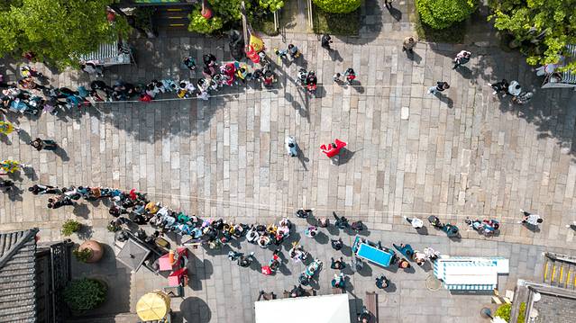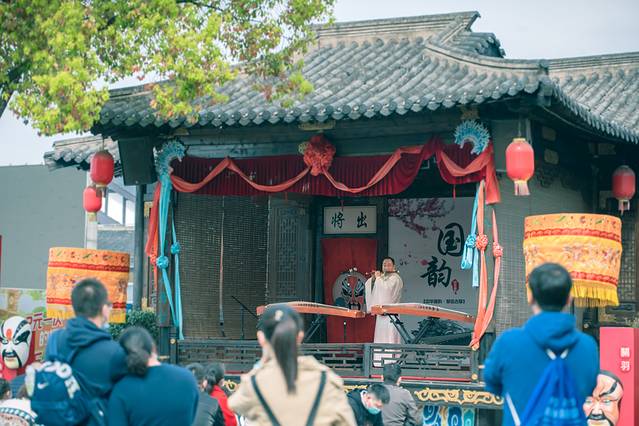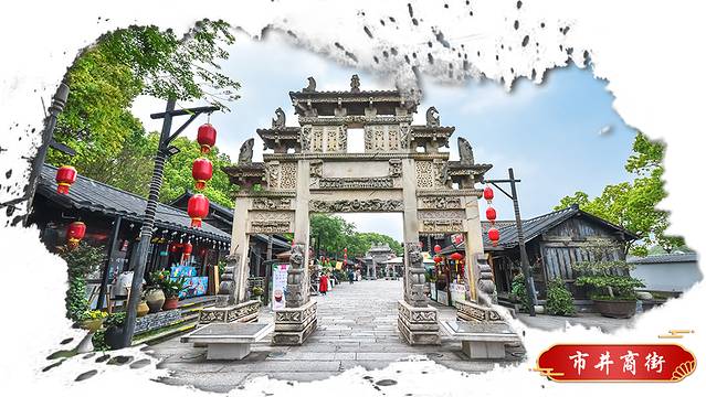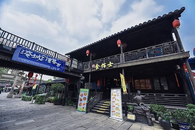 市井商街承接了诸子百家园,是由乐园统一经营,融演艺与商品售卖为一体的集中场所。这里再现了古代民间杂耍、曲艺、叫卖、星相、占卜等三十六行以及市井九流的千姿百态,游客也可以在此挑选到合意的旅游纪念品。每一期国风演出,市井商街是客流聚集最多的地方,因为演出的风格也更为多元。有叙事、场景对白、杂技表演、群舞快闪等,加上周边休闲小吃、文创商品店的配套,逛吃逛吃、游乐游乐,就是小半天。