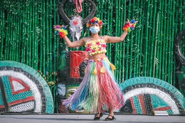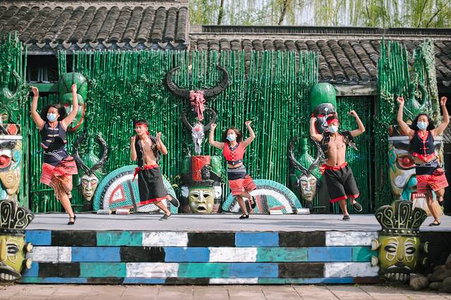 佤族演员身着原始服饰,手持各类猎物及狩猎器械,土风舞、镖牛舞、狩猎舞等土著表演,展现异域风情,让游客充分感受古老的部落风情。演员更不时穿行于游客中间,与游客互动嬉戏,带来意外惊喜。