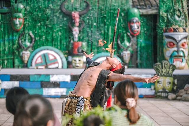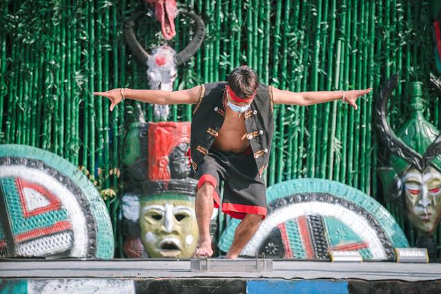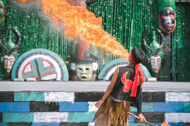 佤族,是我国56个少数民族之一,他们主要分布在 云南 省。能歌善舞的佤族人,对歌舞有着与生俱来的理解能力和技能掌握能力。所以,这场演出是多年保留下来的必看演出,时间分为上午、下午场次,所以不用担心会错过。开场便是一个“踩刀刃”,夺目惊心,扣人心弦,专业表演,请勿模仿哟~不过还是很精彩,第二个就是佤族舞蹈,缓和一下惊心动魄的紧张氛围。接下去就是一个喷火表演。