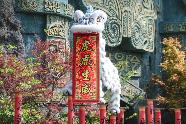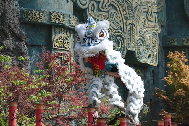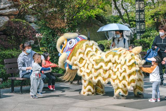 中国 自古以来,南狮北狮成为传统民俗表演文化中的一个经典代表。而淹城春秋乐园,也是推陈出新。在阴阳家广场,游客可倚靠露天座位,享受灿烂 日光 浴的同时,全景欣赏梦幻的舞狮脚步,哦,当然开场便是金色、白色两头 狮子 与现场的小朋友亲密互动,憨态可掬,也让萌娃们兴奋不已。