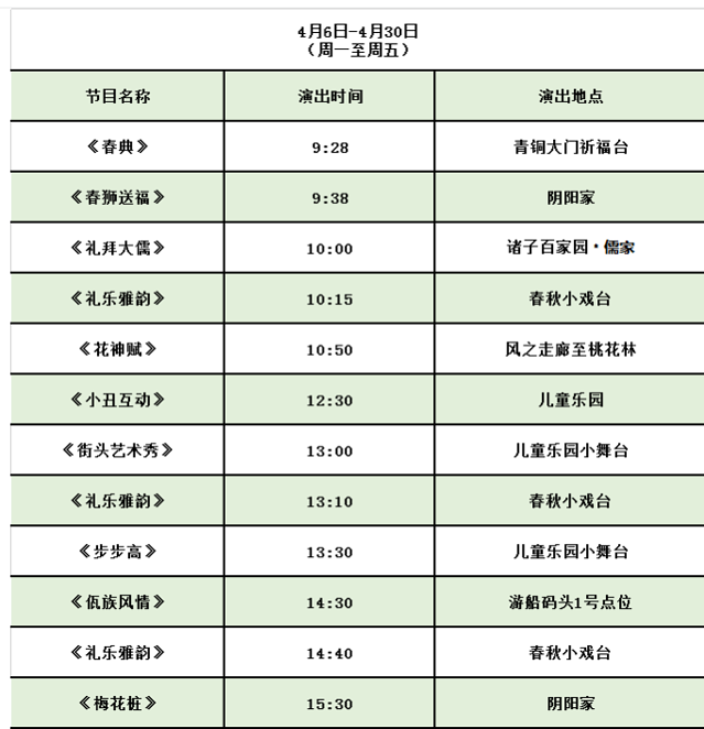 3)演出信息:以下为4月演出时间表,五月演出以景区当日告知为准,五一小长假的演出,比文中演出更精彩,不容错过。