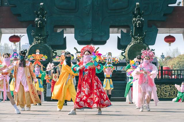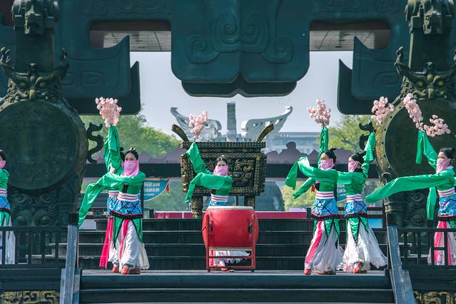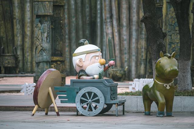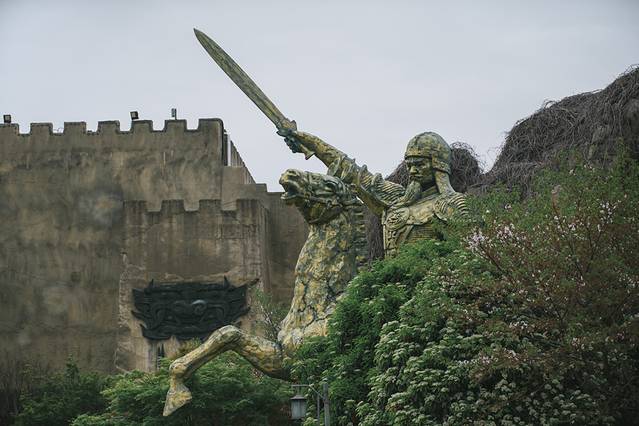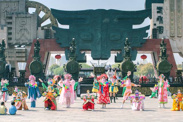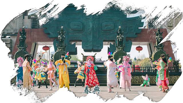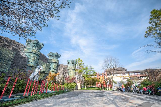 从地标性的青铜大门检票进入,就是青铜舞台,这里每日会上演第一场迎宾演出,这种演出形式在国内也是首创。春秋乐园的青铜饕餮艺术大门,长88米、高23米,总耗600余吨青铜,无论是造型的艺术美感,还是体量的恢宏气势,都堪称国内旅游景区第一门。当然请注意时间,第一场演出大约是9点半左右开始,然后依照游客游览线路所经过的景点,依次演出。