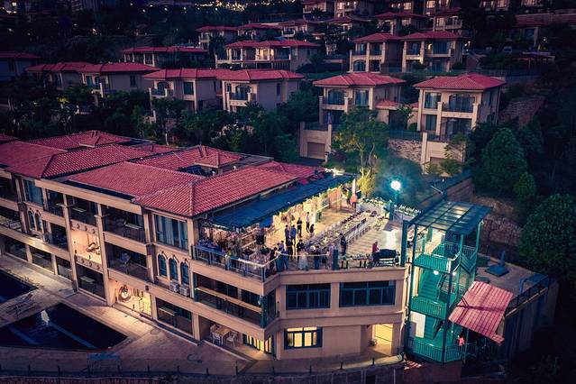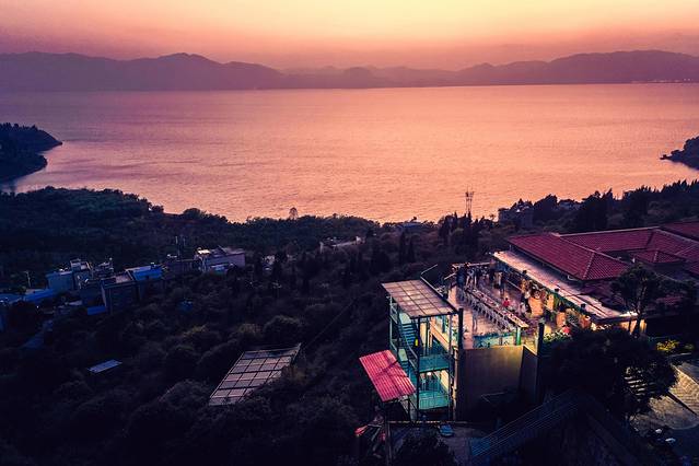 傍晚返回希尔顿酒店,在对面的度假村里的二楼平台上享受烧烤大餐,从这里可以看到抚仙湖湖边的夜景,就连天空都还是带着粉色的,远处一幢幢层次不齐的小楼亮着光,就像小希腊一样。还有云南本地歌手唱着当地的歌谣,这个夜晚变得更加迷人了。