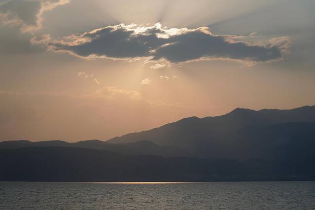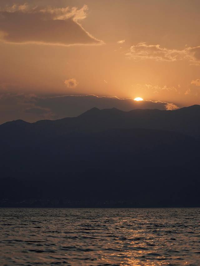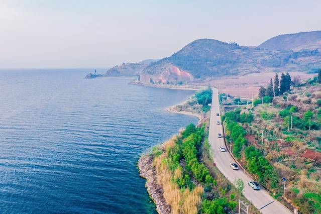 环湖公路其中有一段是向上蜿蜒行驶的山地公路,虽然路面平整,但弯道较多,需要注意行车安全,谨慎驾驶。车辆不多的时候,稍微降速,看太阳在山边慢慢落下,阳光洒在湖面上,整个抚仙湖都金光闪闪。