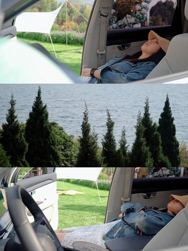 逛累了,就去草坪上停着的凯捷上坐坐,开了一早上的车,放下一二排座椅,享受躺着休息的舒适感,让语音交互代替手动操作,呼叫小五小菱点播音乐,开着天窗,吹着风,闻着清新淡淡的青草味,一天的疲惫都被温柔的抚去。
