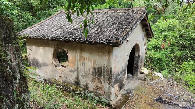 相对于书坑的新茶亭,相距几百米的潮塘老茶亭则显得破败不堪,少了半边屋顶,茶亭内外都长满了杂草。为了让我能进去看看,清哥用木棍砍出了一条小路,看他那熟练的动作,就知道他为维护古驿道出了不少力。