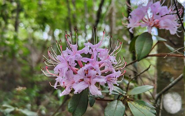 “还靓个花啊!”清哥一句响亮的赞叹声,将我拉回了现实。我顺着清哥指示的方向看去,果然,古道旁有好几株野杜鹃,此时正开着一束束粉红色的花儿,看起来很是好看。我于是掏出手机,对着野杜鹃,移动着手机,选择最佳的角度,拍了几张漂亮的杜鹃花照片。