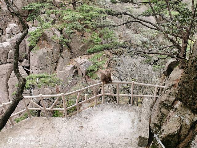 路上还遇到了生活在黄山的猴子,第一次在野外如此近距离的接触。周围只有这一条路,而我又必须要从它身边经过,再加上景区规定不能给野生猴子投喂食物,所以,我不知道它是怎么想的,反正当时我离它最近时,心跳应该达到了110(我怕它打我......)