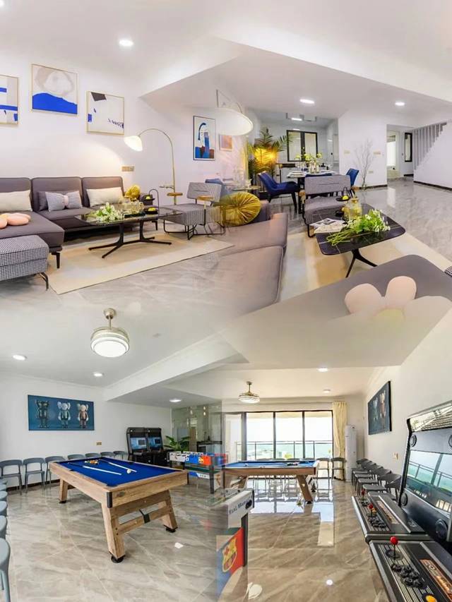 ✔三楼有多功能海景娱乐厅,配备超大电视机、可以连接电玩、桌球、游戏机、桌面足球等丰富的娱乐设施。