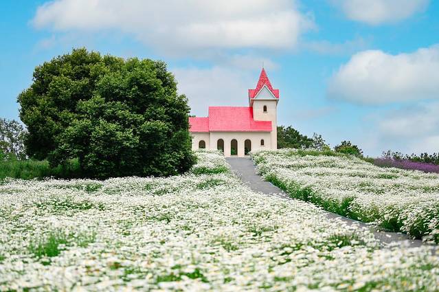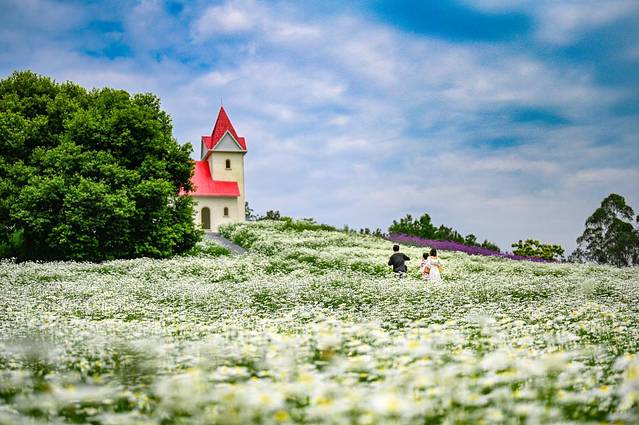 成片的小雏菊烂漫之极,还有一个田园风十足的小建筑,完全就是点睛之笔,站在花丛中间,你就是花仙子本仙了。