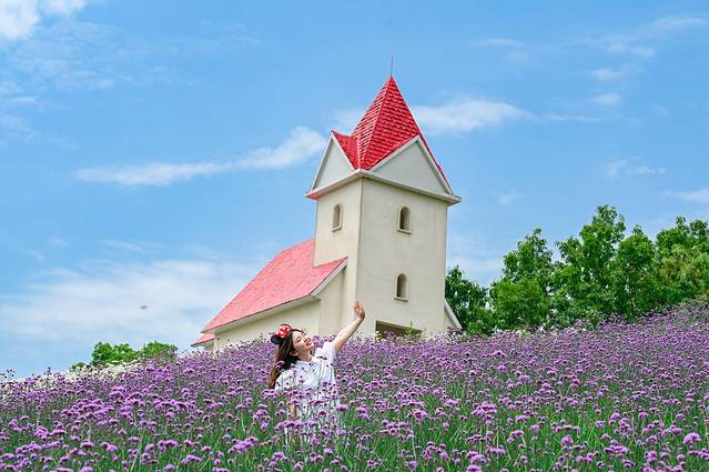 在小雏菊的另一边,是一片紫色的薰衣草,穿着白色的小裙子,整个就是一小清新风格,现在花期正盛,还可以get同款薰衣草美照。