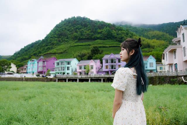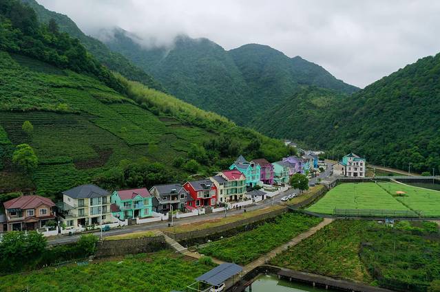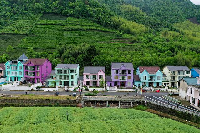 从分水镇行驶到白江镇,一路都是满目翠绿的春光。在百江镇百江村冯家遇见“七彩民宿集聚区”,一幢幢粉刷蓝色、白色、薄荷绿、米白、淡蓝色的建筑与绿意盎然的田园山谷相互映衬,构成了一幅色彩生动的“七彩梦画”。