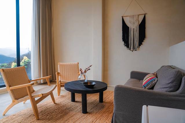 山居的精髓在于早睡早起,重拾城市中休息日不曾有的生活节律。早起的阳光温柔,窗外的景色早已按捺不住万物复苏的欢欣。落地玻璃窗把居住空间和自然环境融为一体,阳光无遮挡、全方位地投射进来。