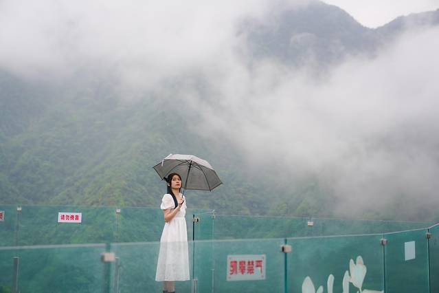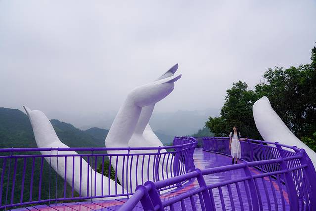 洁白修长的纤纤玉手托起行走的步道,游客穿行于密林雨雾之中,恍如仙境。