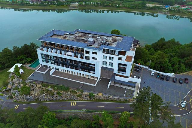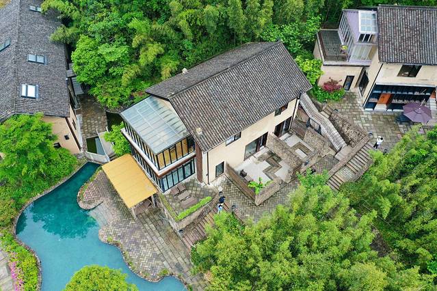 纯白的墙体设计,增加了建筑的线条感,隐于青山绿水之间显得低调而高级。餐厅、酒吧、咖啡厅、儿童休闲区、江景无边泳池等一应俱全,几乎能够满足你对于理想山居生活的所有想象。