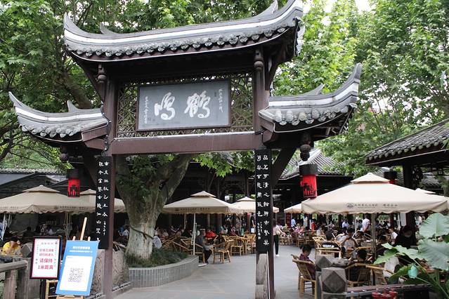 1923年的时候,有一位来自大邑县的龚姓商人到少城公园(现人民公园)踏青。看到公园里溪水环绕,绿树成荫,便起了念头想在这里修建一座亭式厅堂建筑,用以品茗休憩。相传这位龚姓商人起了念头之后,当晚就梦到此处紫光缠绕,一方池塘中伫立着几只白鹤嬉戏,引颈长鸣。“鹤鸣”二字横额为书法家王家桢1940年手书。1952年维修公元被拆除。1988年6月在邀王家桢先生重题。