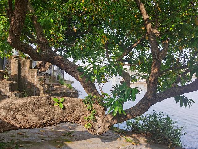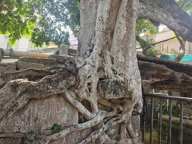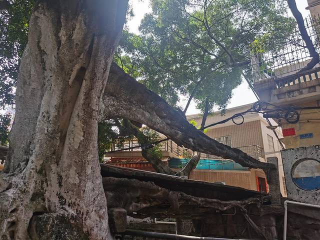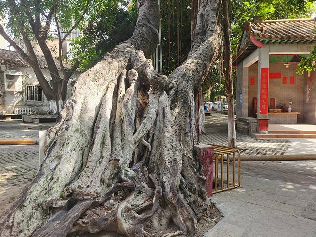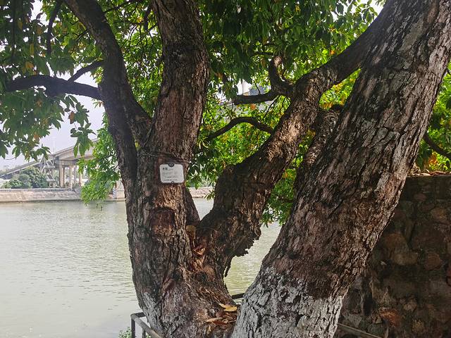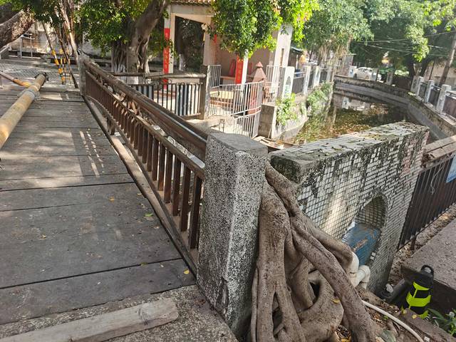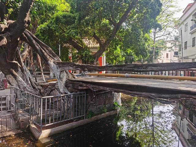 这座始建于明隆庆年间的古桥,至今仍在发挥作用,不停有周边的居民从上面走过。仔细观察,发现河涌两岸共有三棵古榕,南岸两棵,北岸一棵,都需数人才能合抱。从树上生出的气根,在横跨河涌后,又扎入地下生根,这些气根已经十分粗壮,有的充当桥梁,有的充当扶手,果然是榕树生桥呀。
