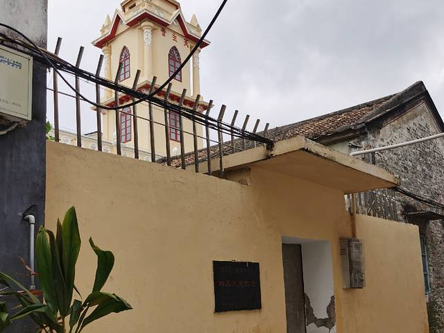 四基这一带要么是传统的老屋,要么是 新建 的小楼,忽然出现一座西式的天主教堂着实有些突兀。原来,天主教在四基的传播活动最早出现在 清道 光十九年(1839年),最初是借村民的祖屋作为活动场地,后由教徒筹款购地建楼,到1928年终成现在的模样,其外形借鉴了 广州 一德路上的天主堂。