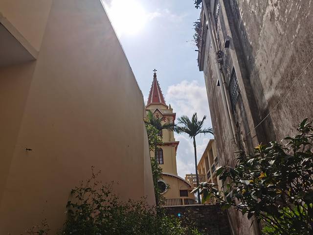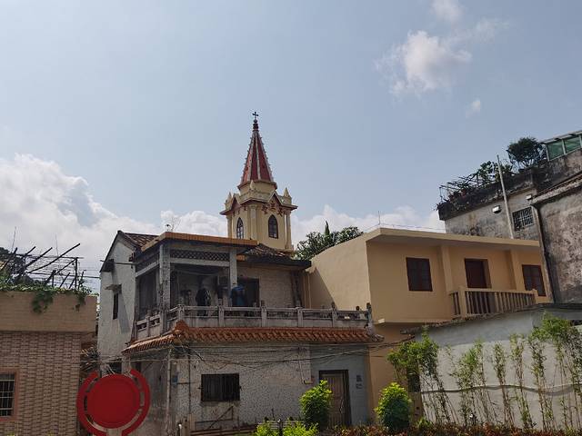 从渔人码头出发,沿德胜河向西,有一个小山坡,名叫扶宁岗,山坡西面的河涌边,有一个小公园,名为四基公园。路边有块巨型黄腊石,上面刻着“新圩公园”,以前这里是“桂洲三圩”之一桂宁圩所在,新圩公园的别名应该就是这样来的。“圩”是定期开放的集市,赶圩就是赶集。来到这附近,很远就能看到一座天主教堂的尖角,因为周边都是传统的老房子,这座西式建筑就显得十分醒目。
