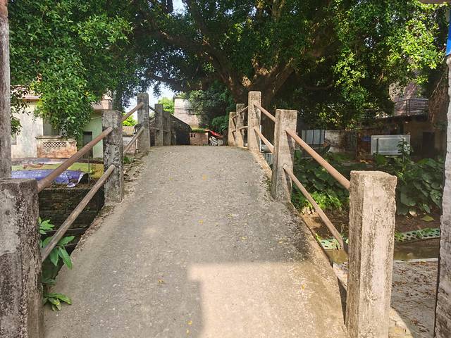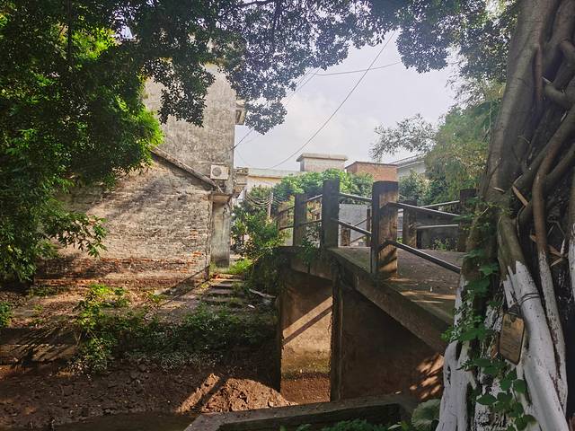 榕树生桥”一般简称为树生桥,位于一个叫容里的地方,这里有一条河涌叫鹏涌,所以这座桥本名鹏涌桥。珠三角一带河道纵横,涌是分布于河流主干道之间的一些小分支。以前这座桥隐藏在一片深街古巷中,并不是那么好找,随着城市的发展,有一条马路已经修到鹏涌的水边了。以城轨容桂站为地标,沿着其北面的新有中路一直向西走到路的尽头,就能看到树生桥的身影。