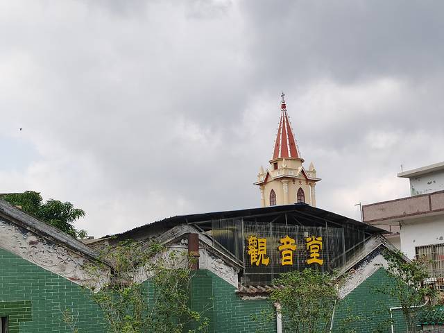 在这座天主教堂的旁边,有一座传统的观音堂,一中一西,倒也相安无事。从观音堂门前穿过,就来到天主堂的围墙边,这里开有一个侧门,门旁有块“ 佛山 文物保护单位”的牌子,全称为“四基天主教堂”。从这里沿小巷拐个弯,就来到它的正门,两扇对开的红色大门,大门是关着的,没办法进去参观,只能在外围欣赏。