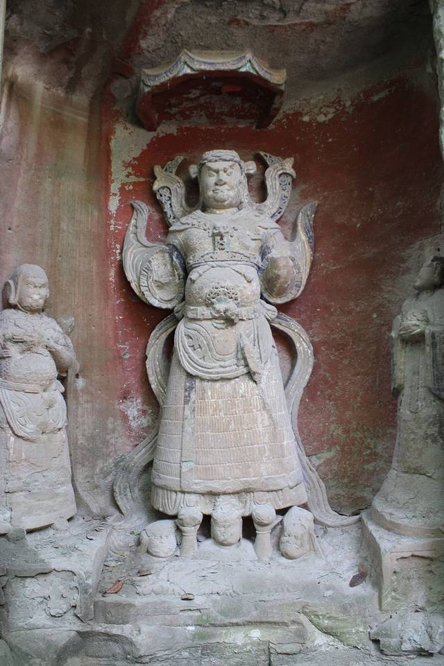 此龛为中晚唐所造,高达2米,为四川省内同时代天王造像体量最大者。该像头顶华盖,面相丰圆,神情威严,双手均残损。窟中天王怒目圆睁,肩后披巾与飞带均昂扬上举,作怒发冲冠状。上身着鳞状锁子甲,下身着窄条密强铠甲战裙,右手紧压在右大腿上,左手残。护心镜处有一兽吞型、腰带扣处有一环状锁扣均为镂空雕出,雕工极为精湛。地鬼两手趴地,身半侧,右腿半弯,以整个背部和右腿膝部托举天王,天王左腿处尚有一秃头地鬼双手奋力托举天王左腿,神情严肃。天王左右各分侍一神将,一手执长剑指天,装束与天王相类,但无护心镜及腰带扣等细节雕饰,体量仅为一米左右。此像体量巨大,造型威严不凡,雕工精湛纯属,堪称唐代天王造像中的旷世遗宝。