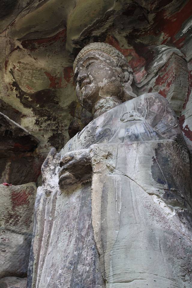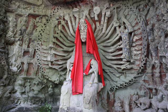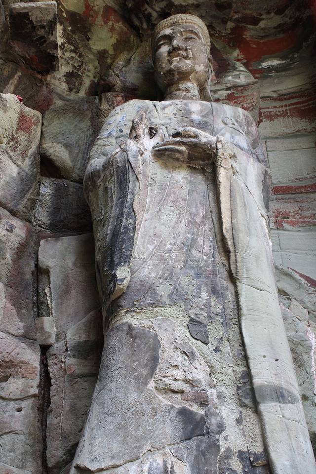 主像是”千手观音“,这就是唐建中四年(783年)雕刻的,是晚唐观音造像的杰出代表,堪称孤品。观音像高2.3米,端坐中间。头部宝冠为镂空雕法极其精细,面容丰满圆润,嘴角略微上翘,似笑非笑,造型生动精致。背部雕刻出内外两层,紧密展开的两圈手臂,各执不同法器。外展有两圈手臂,在其指端,镂空雕出一圈菩萨背光,呈火焰烧灼状。两侧刻有飞天、侍从、阿修罗、紫那罗、迦楼罗、乾因婆、摩喉罗迦等天龙八部众诸神,多达91人。这是四川境内保存最完整、体量最大的唐代观音,当是同时期观音摩崖造像中的孤绝之品。