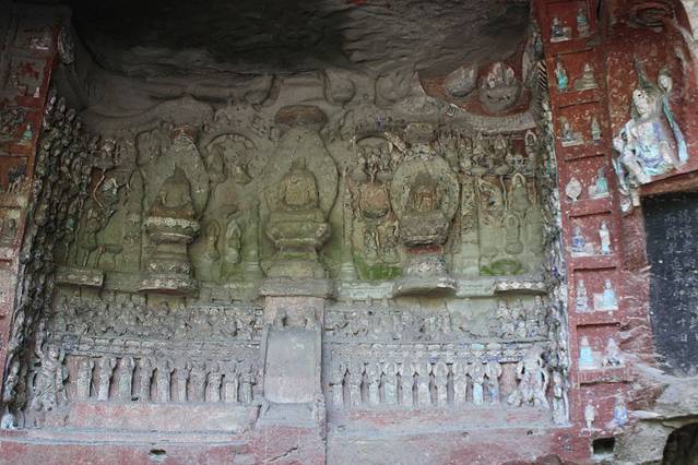 此处石窟为晚唐时雕造,是四川省内体量最大的唐代文殊菩萨骑狮像。其中“华严三圣”三主尊造像高2米以上,在省内唐代同题材摩崖造像中为孤例。此窟规模宏大,雕刻精美,文殊菩萨座下青狮的鬃毛刻画细腻,呈波浪卷曲状,因年久失修,剥蚀风化严重,主尊面容已模糊。