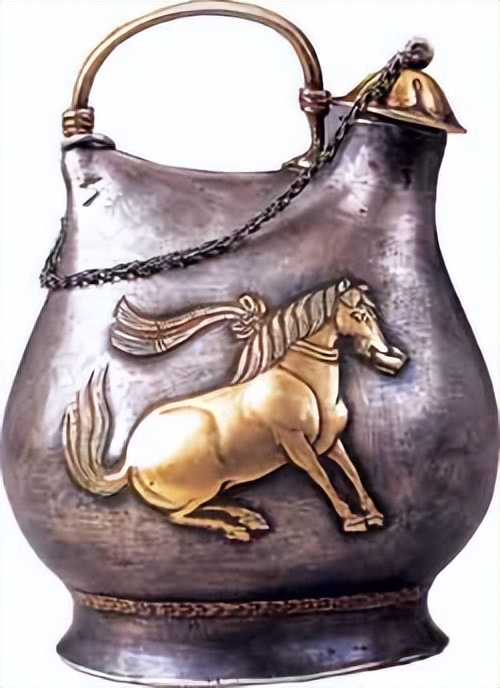 盛唐时期著名银器。1970年陕西西安南郊何家村唐代窖藏出土。通高18.5厘米。这件仿北方少数民族契丹族的皮囊形壶铸造的银壶,器腹两面均锤出一马衔杯纹,马颈系飘带,昂首扬尾,似作舞状。纹饰鎏金。形制优美,银壶上的舞马衔杯造型正是当时舞马为唐玄宗祝寿情景的真实再现。同时又是国宝级文物,是唐代中原汉族与北方契丹族文化交流的物证。