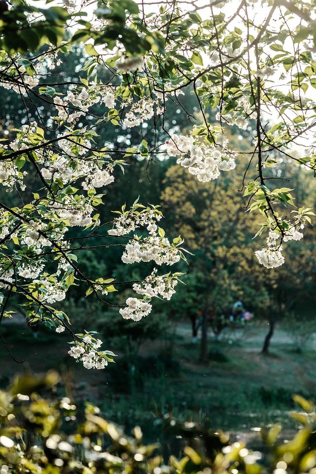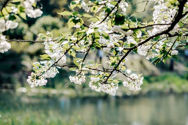 每年几乎所有花都凋谢完之后,只有乌龟潭的晚樱在灼灼绽放,随风摇曳的樱花,波光粼粼的水面,三三两两的行人走过樱花树下,小径深幽,“和春住”应是此般意境了